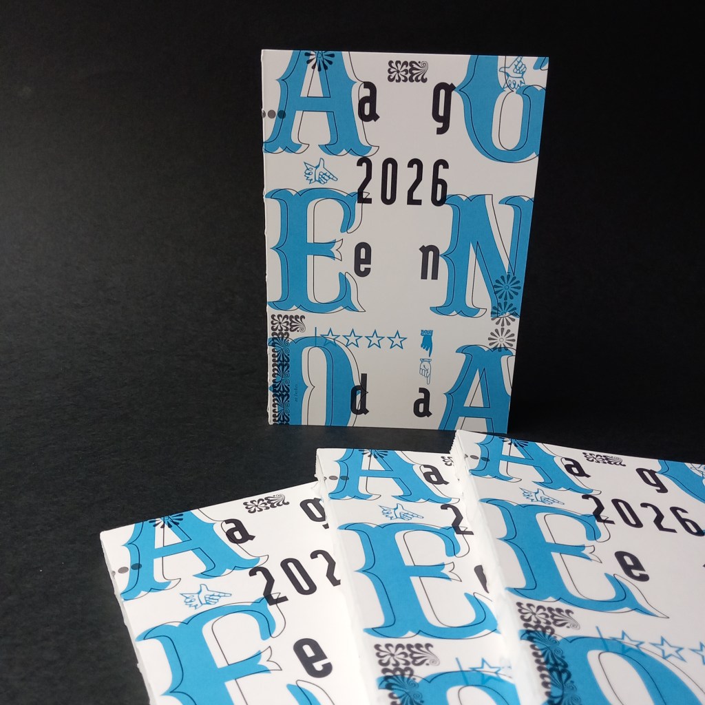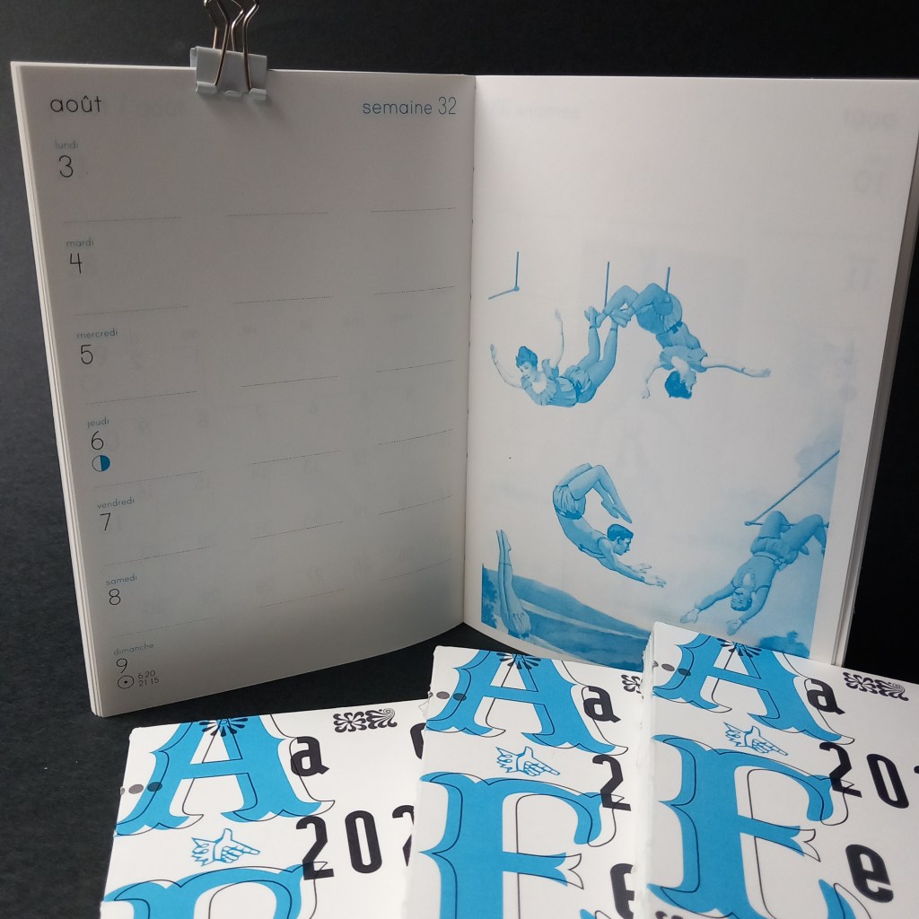 L’atelier Reliure Volumen publie chaque année un agenda dont les semaines s’accompagne d’illustrations issues de livres anciens. Cette année présente deux modéles : TYPO et CIRQUE.