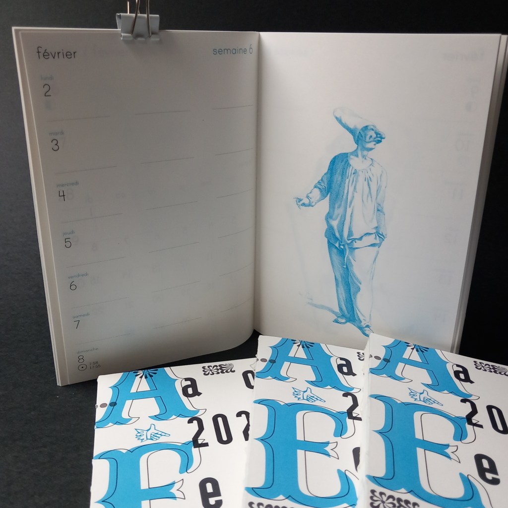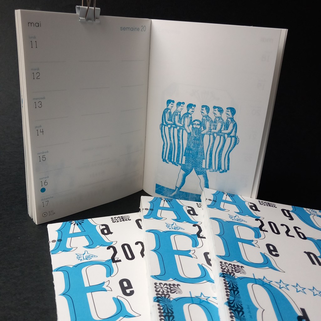 Les références de ces ouvrages sont détaillées en fin d’agenda et sont disponibles à la consultation et au téléchargement sur http://www.archive.org. — prix de vente public : 20 euros . Disponible à l’atelier et en librairies : (à Bxl) Les Yeux Gourmands, Météores, Par Chemins, Candide, Maison CFC, Grafik, Brin d’Acier, (Namur) Papyrus, (Liège) Le Comptoir du Livre, (Lyon) Lettres à Croquer, Livre En Pente, (Douarnenez) Angle Rouge, (Paris) Librairie du Jeu de Paume.