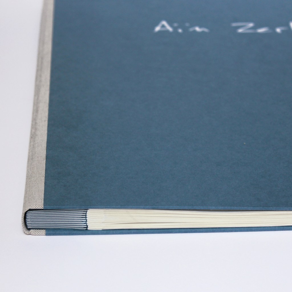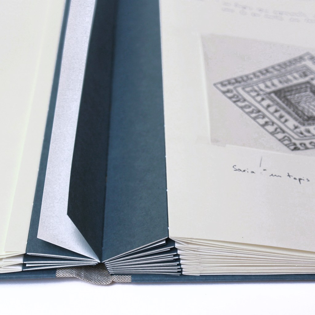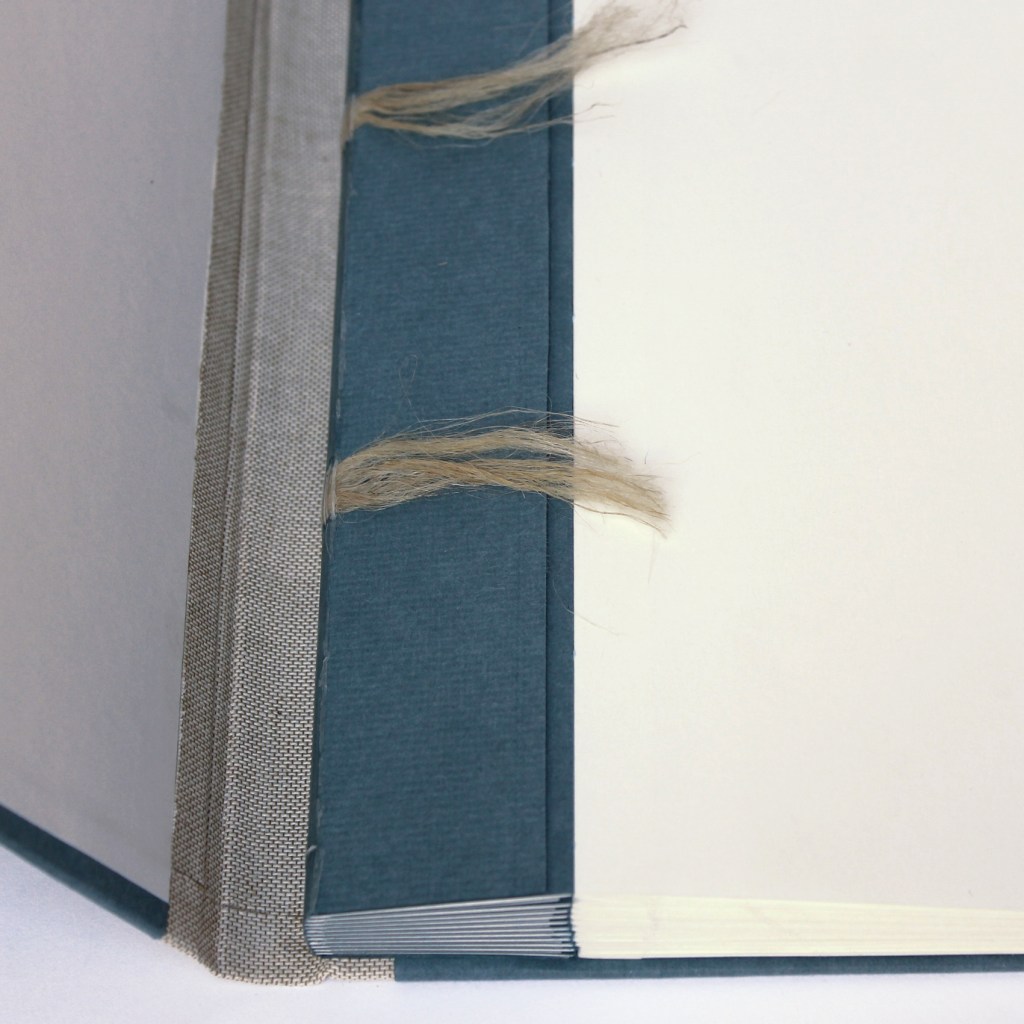 Hybride de reliure suisse et Bradel, liens de chanvre apparents.