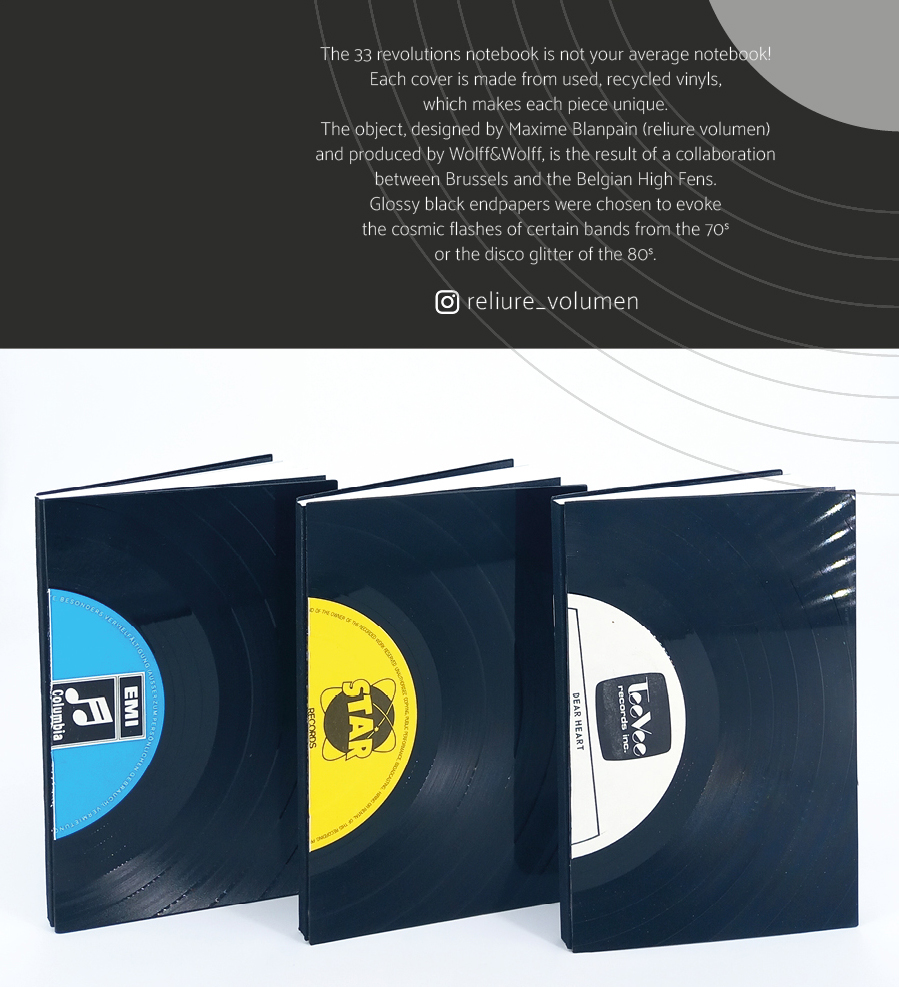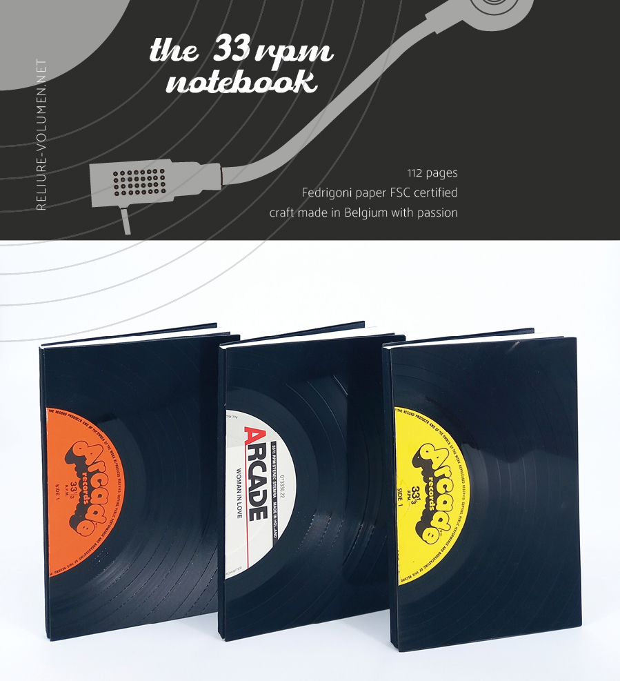 The 33rpm notebook features a vinyl disc cover and 112 pages of Italian paper. With a thread-sewn binding and glossy black end-papers, it is available in Europe upon request. The notebook’s size is 11.5 x 17cm. Contact agenda.volumen@gmail.com for orders.
