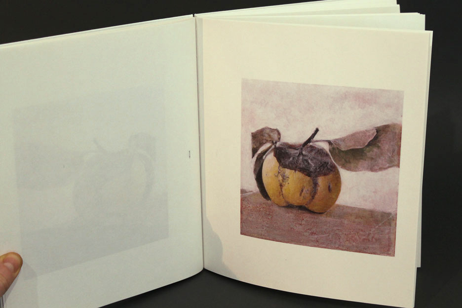 72 reproductions d’une peinture à l’huile de 15x15cm. Les 72 images, s’étalant sur les 90 jours de travail pictural, figurent un fruit dont la nature, la forme et les couleur évoluent dans le temps autant que sur ces instantanées, comme une archéologie de la peinture finale.