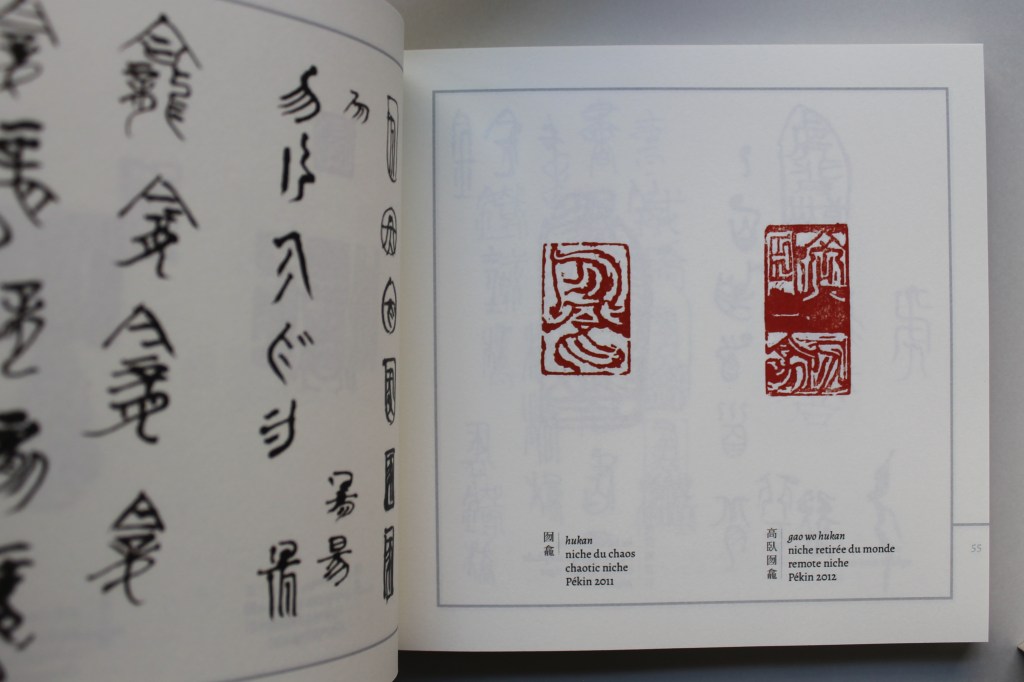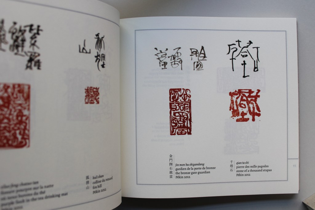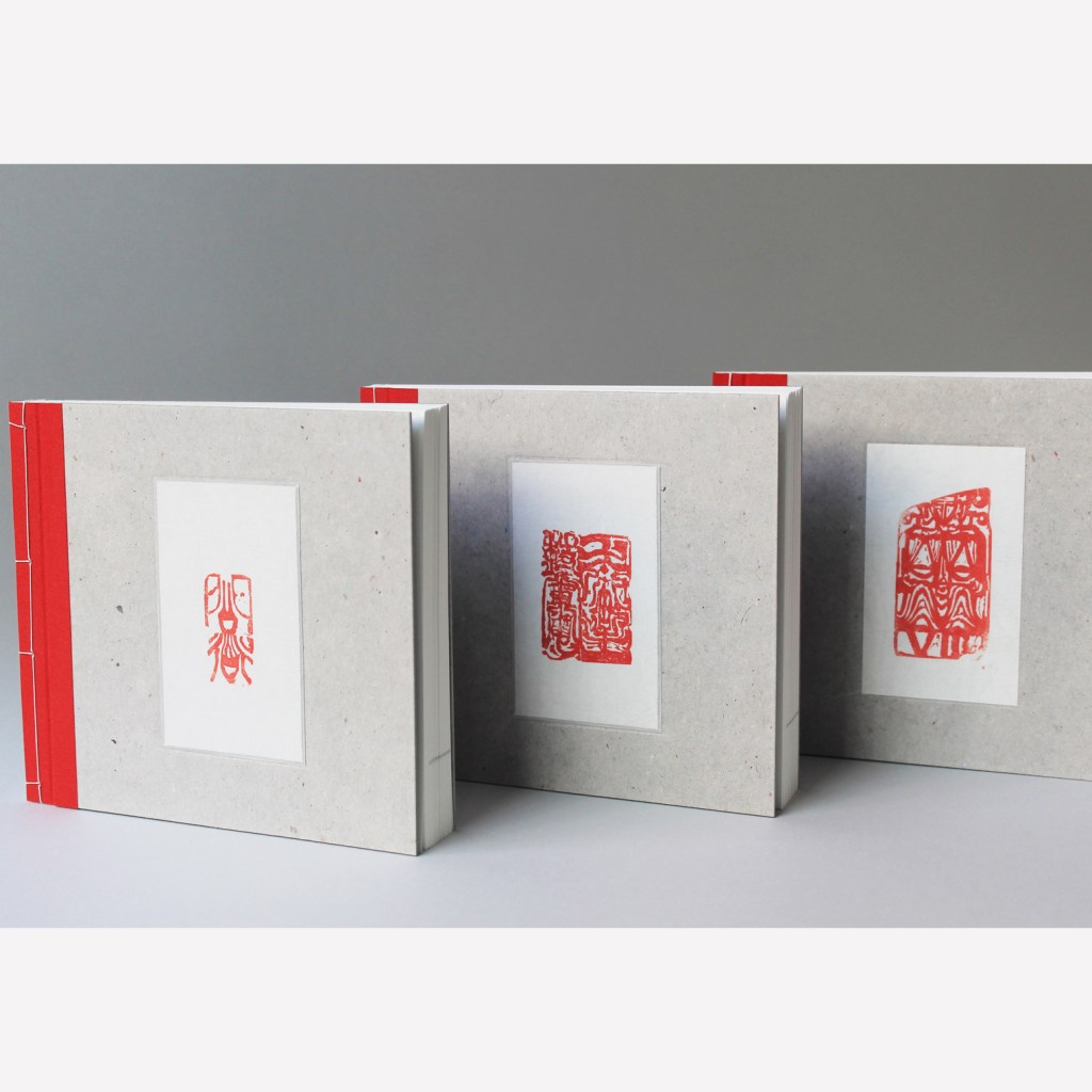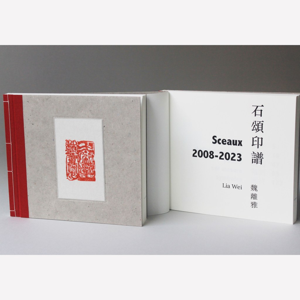Recueil de sceaux chinois créés par Lia Wei de 2008 à 2023. L’édition de tête (50 exemplaires) est façonnée en couture asiatique, toilé rouge sous la couture, avec plats de carton gris. Chaque couverture est gauffrée et incrustée d’un sceau original. 15 x 16,3 cm. 194 pages.